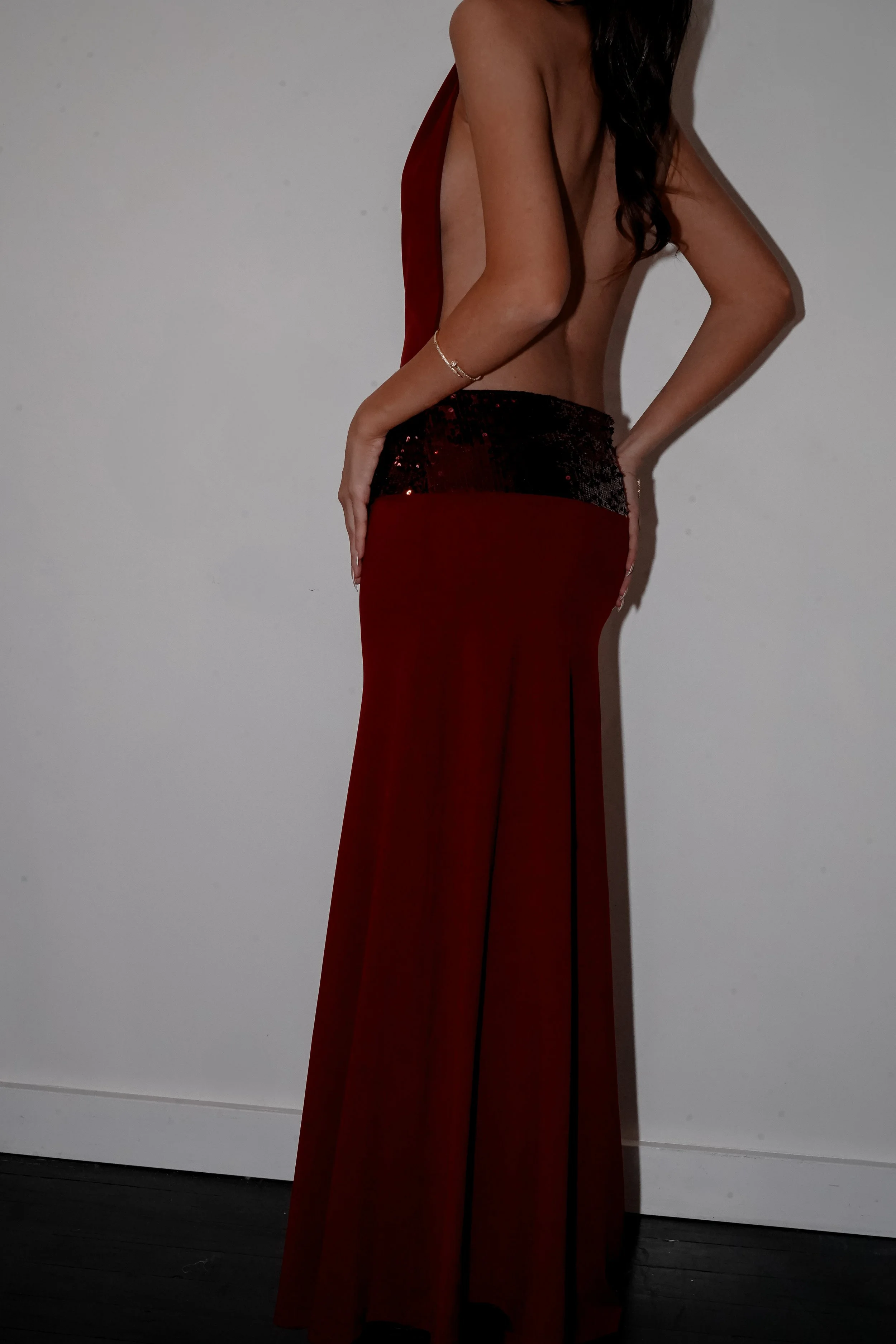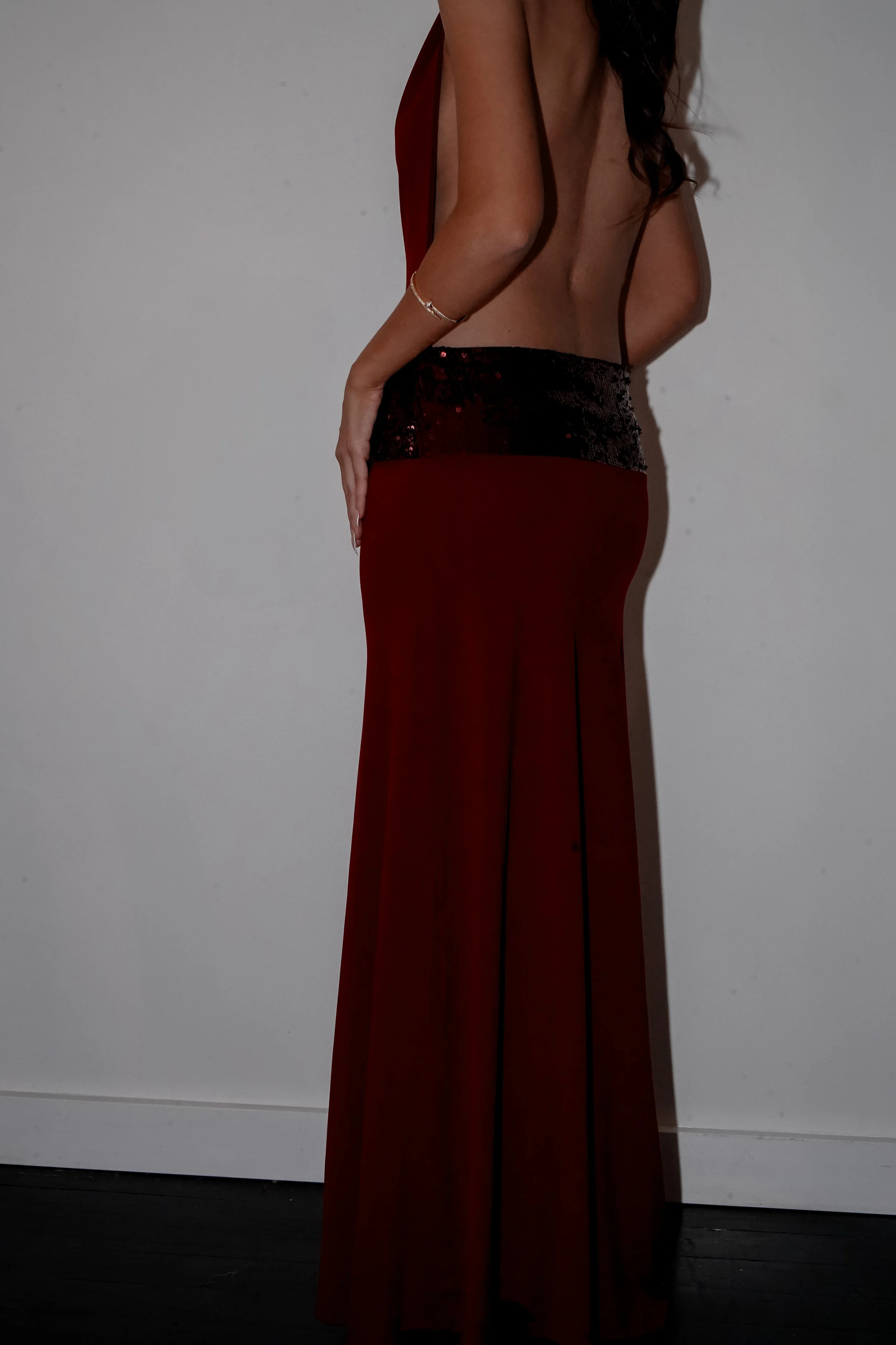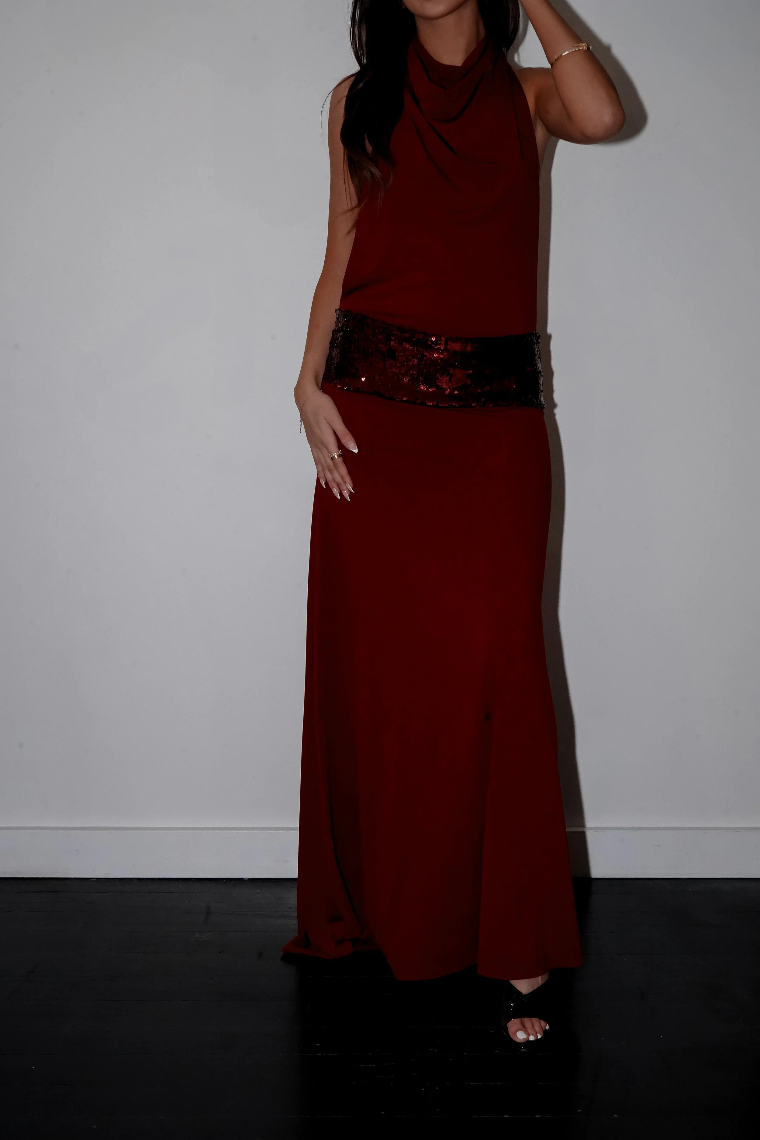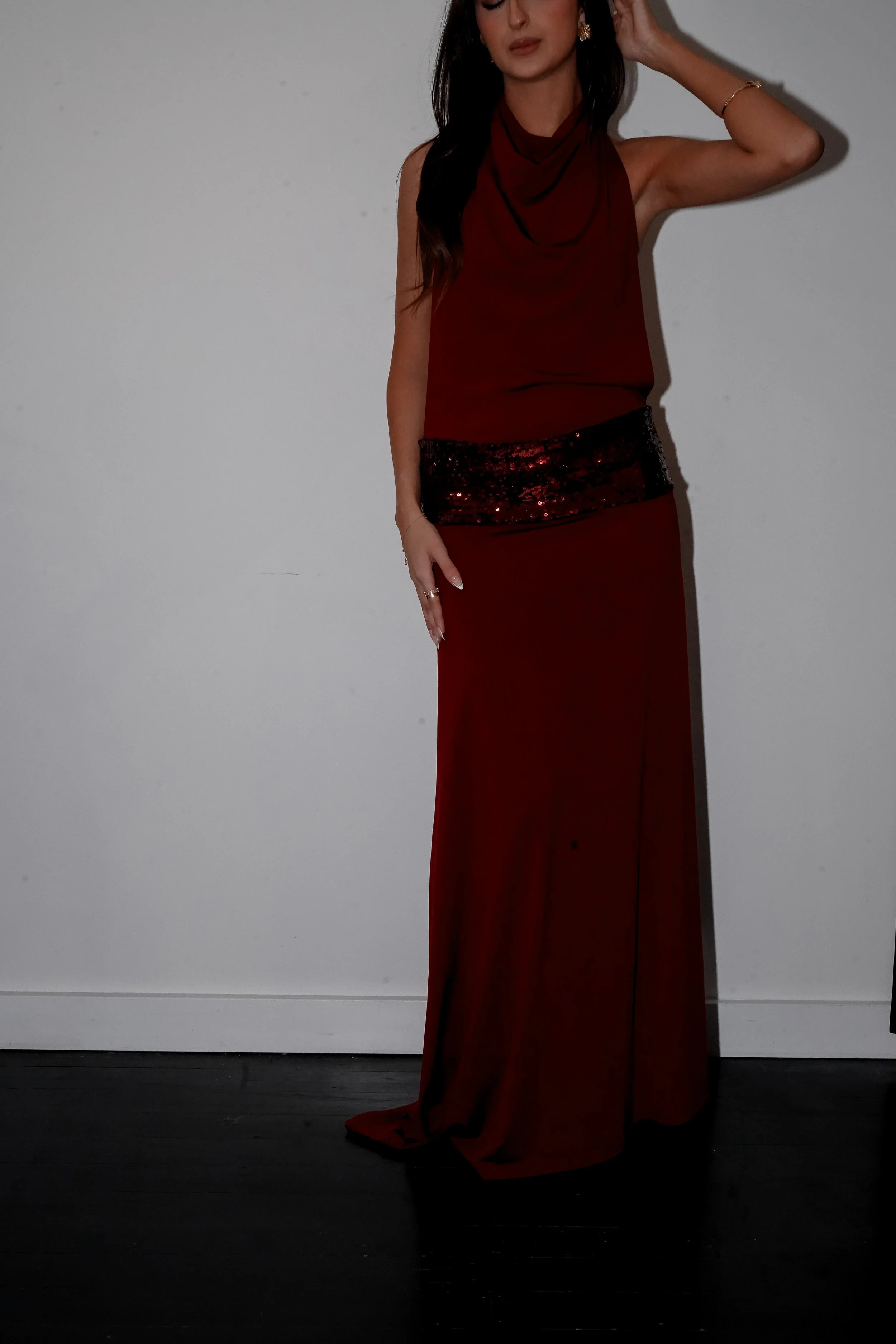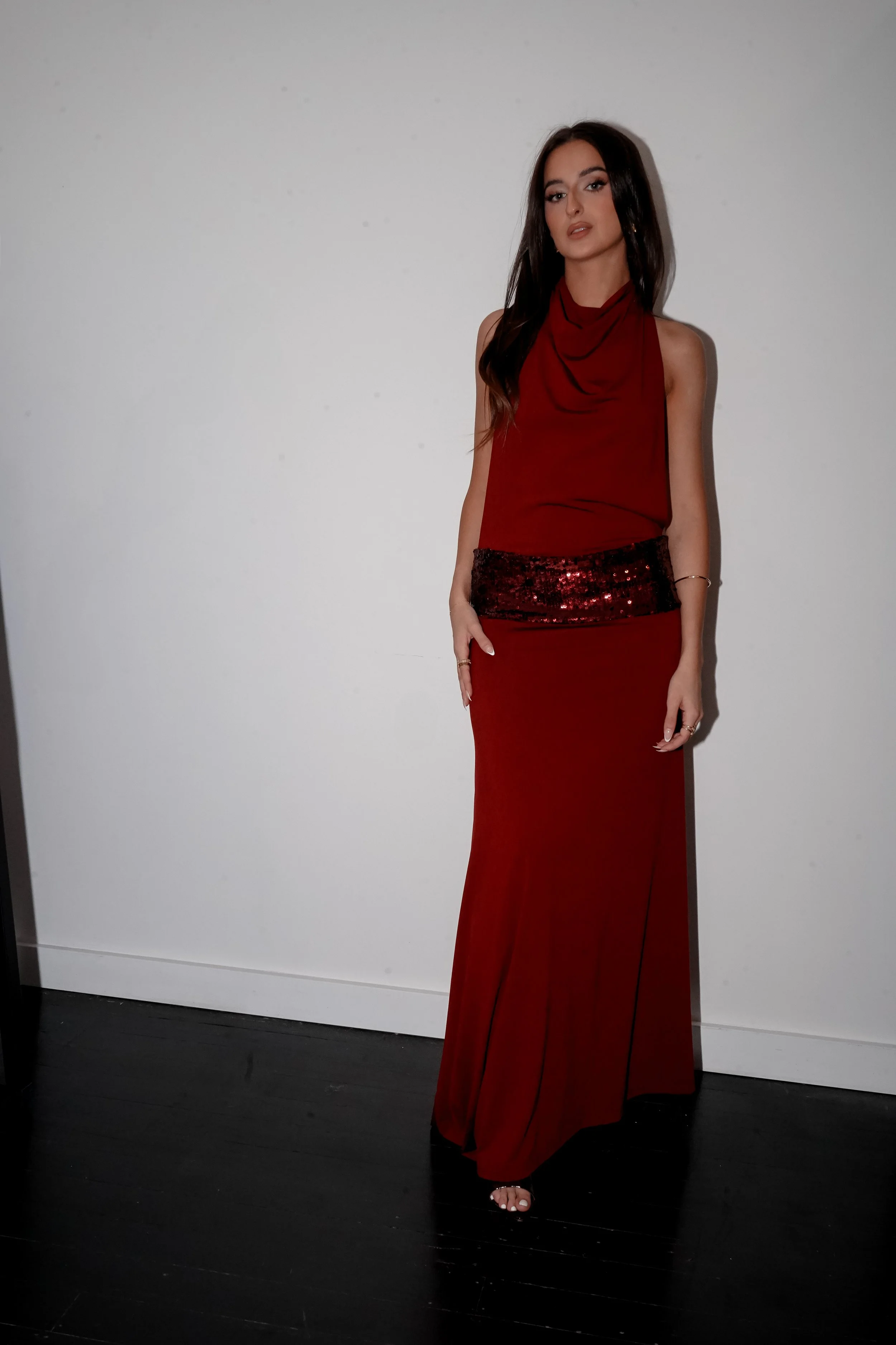 This halter gown features a draped cowl-neck and an open back. The shimmering sequinned waistband sits low hugging the hips and adding textural definition. The fluted skirt drapes asymmetrically, flowing beautifully as you walk.
