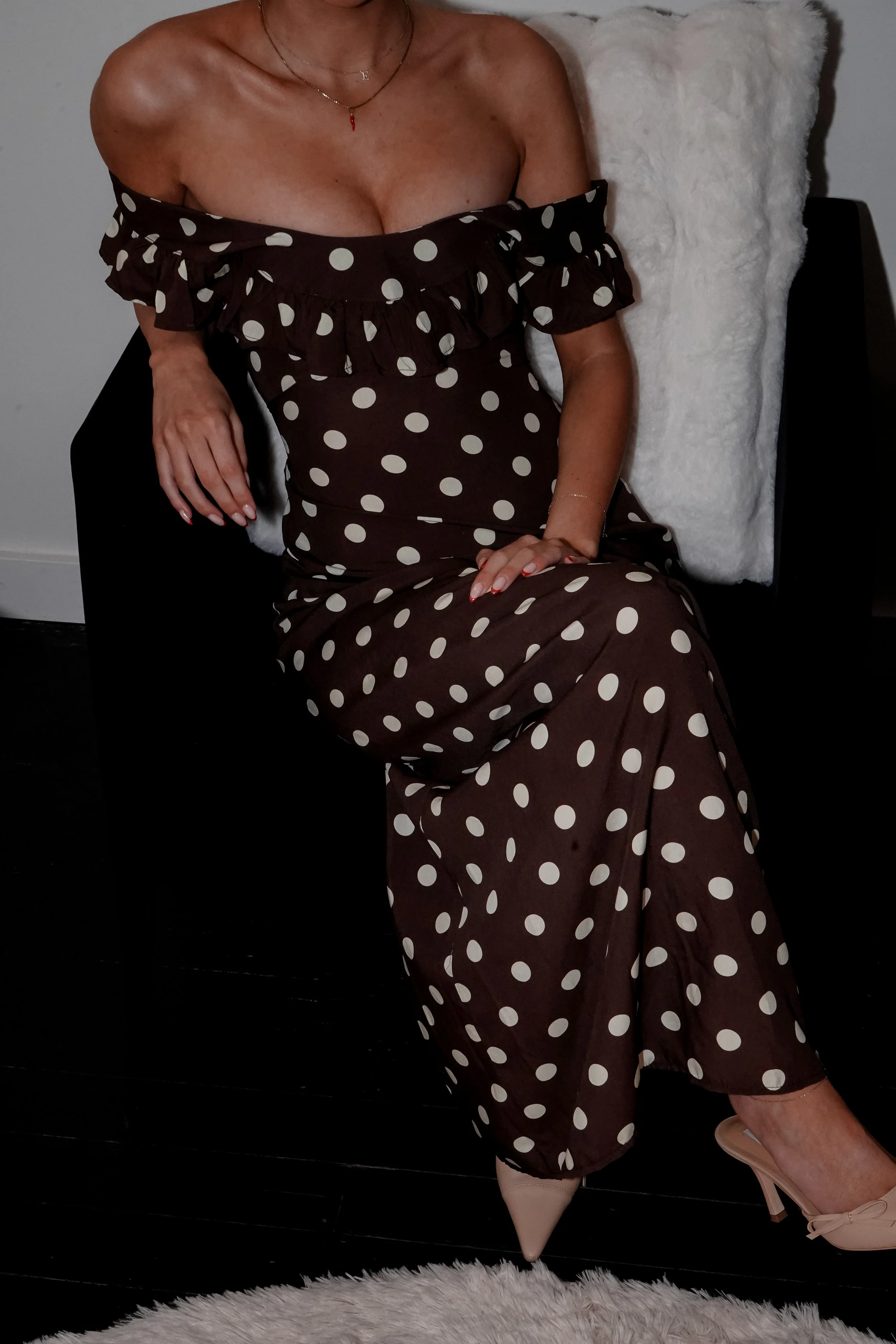 A feminine maxi dress with a timeless polka dot pattern. The design features a flattering fit with delicate ruching details at the shoulders and an elegant open back that adds a modern twist. The delicate tie straps at the sides highlight the waist, creating a beautiful silhouette.Material: 100% viscose