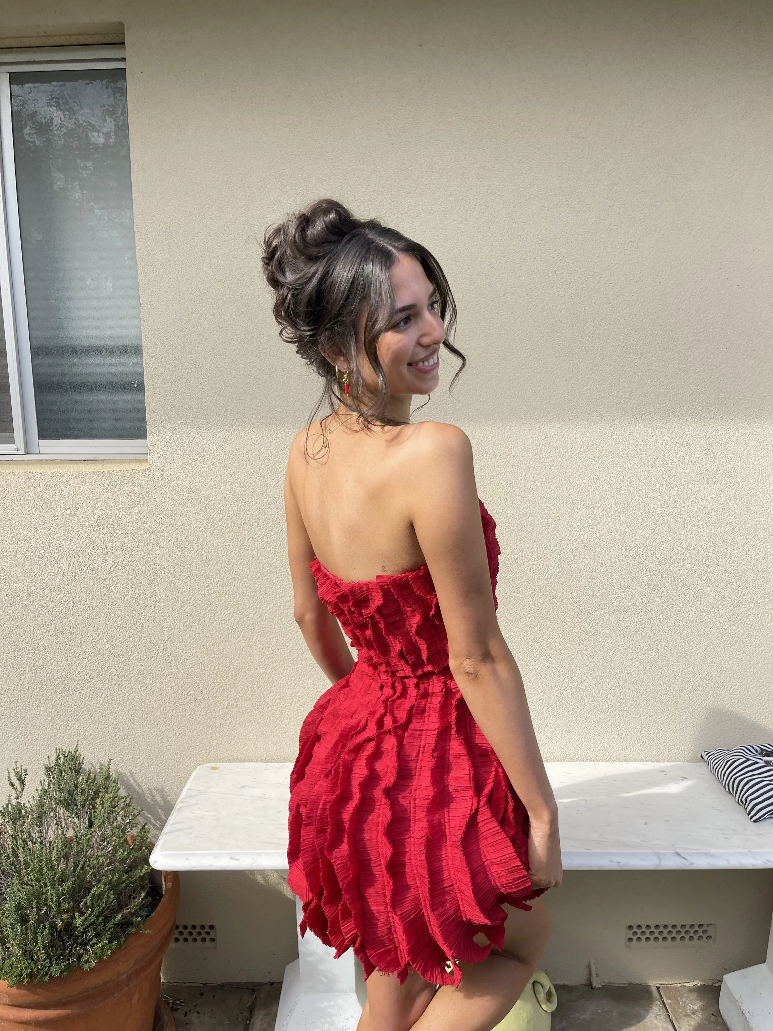 featuring an off-shoulder design crafted from a lightweight stretch mesh and flattering cupro skirt with a cowl on the left side waist. The overlapping skirt and mesh bodice creates depth, with the option to show more skin on the wearer's left hand side waist.