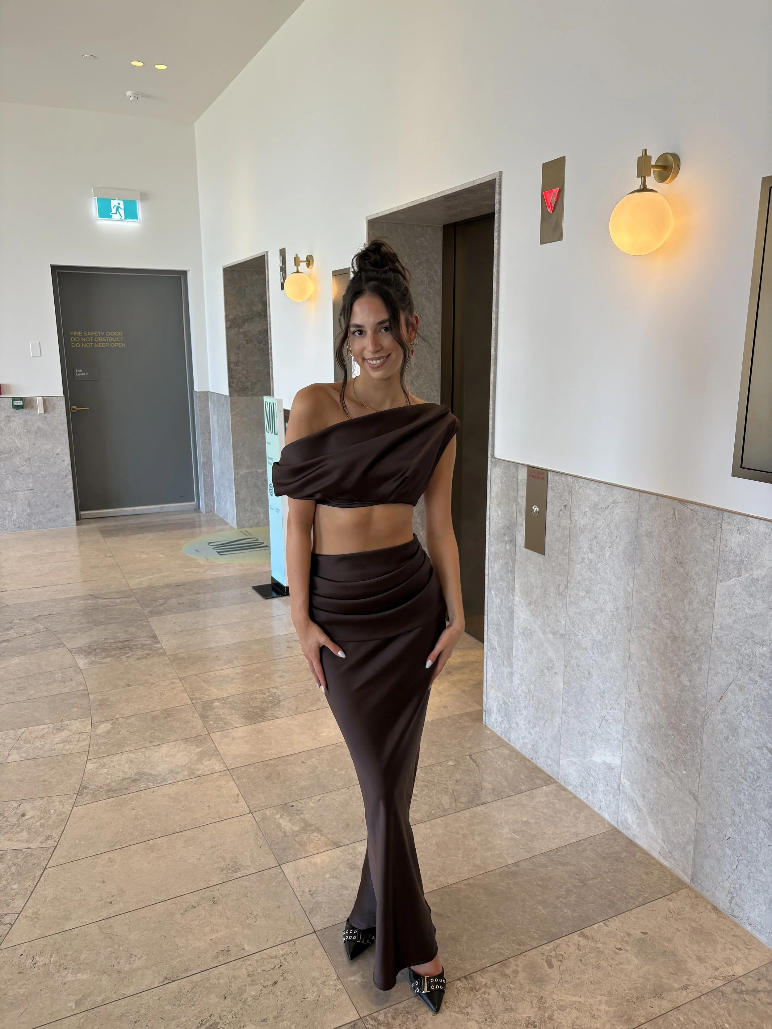 Made with a gorgeous stretchy beige fabric. This set exudes elegance and a hint of sexiness with its design. The fabric is smooth and luxurious, draping softly against the body. The silver metal O-ring detail adds the final touch.
