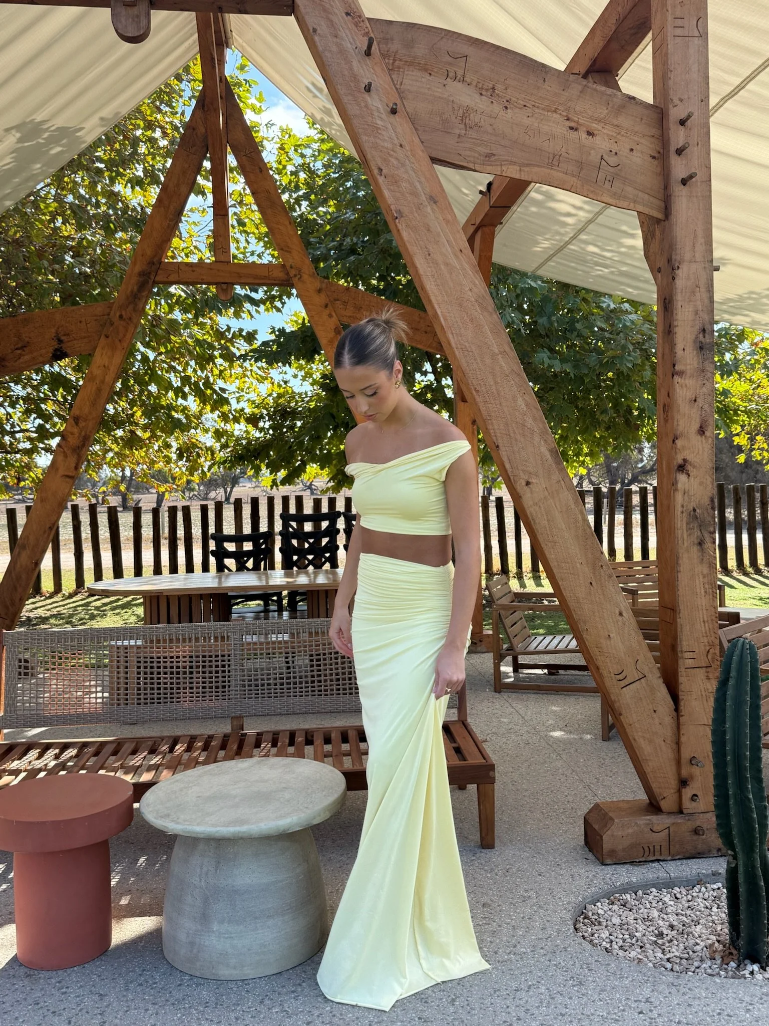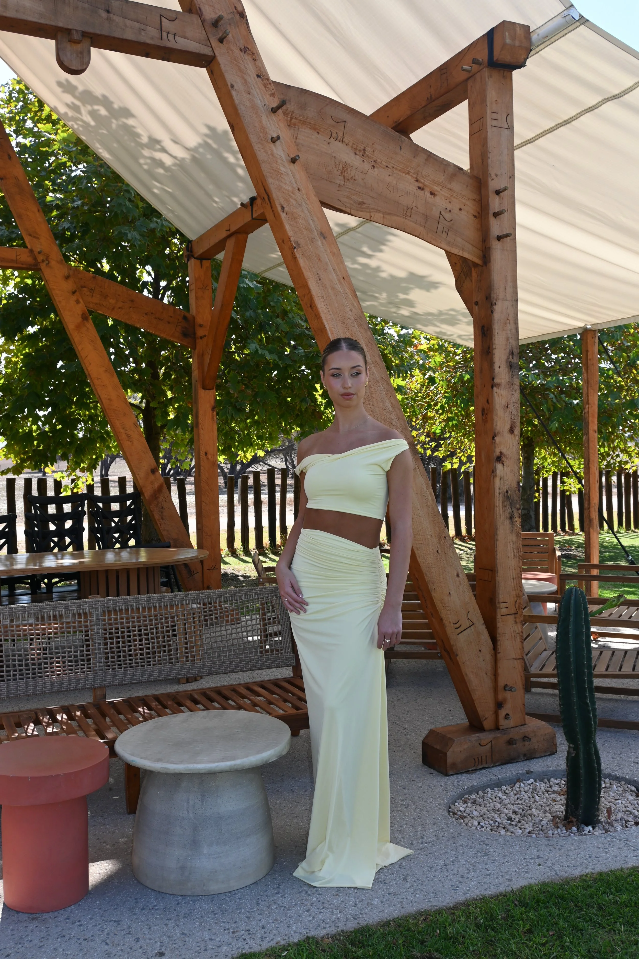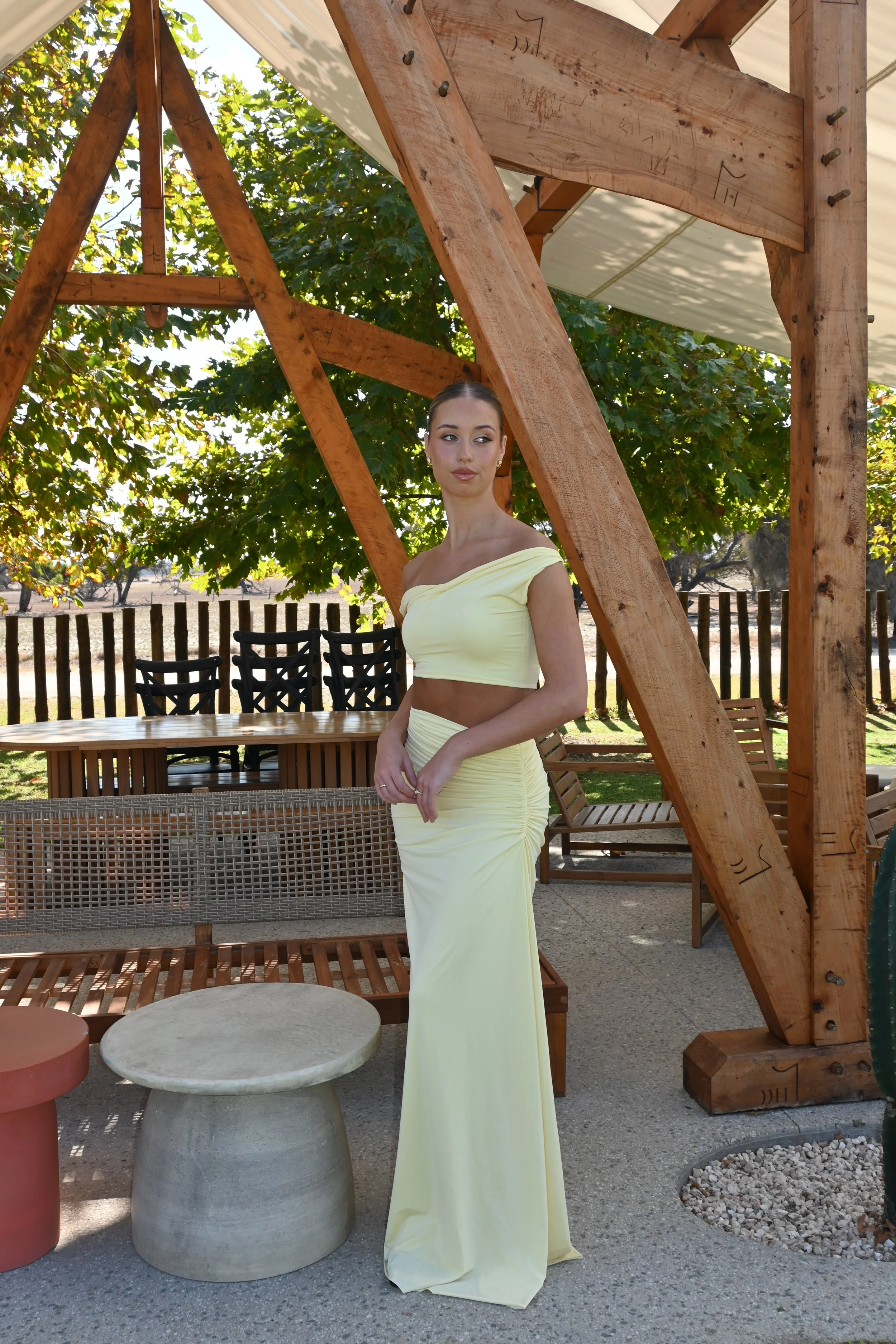 This set includes a crop top with draped shoulders and a long skirt with stylish ruching.