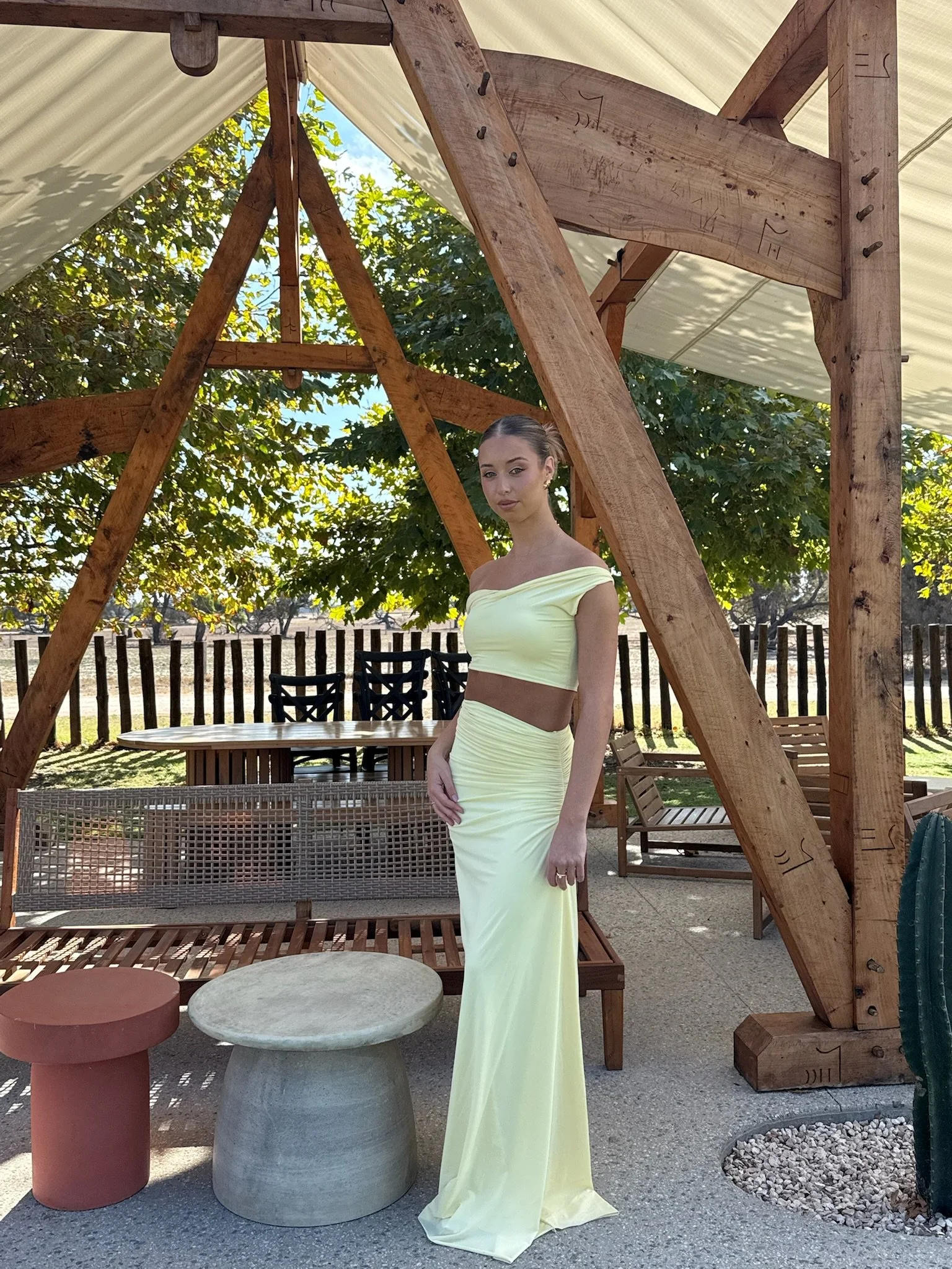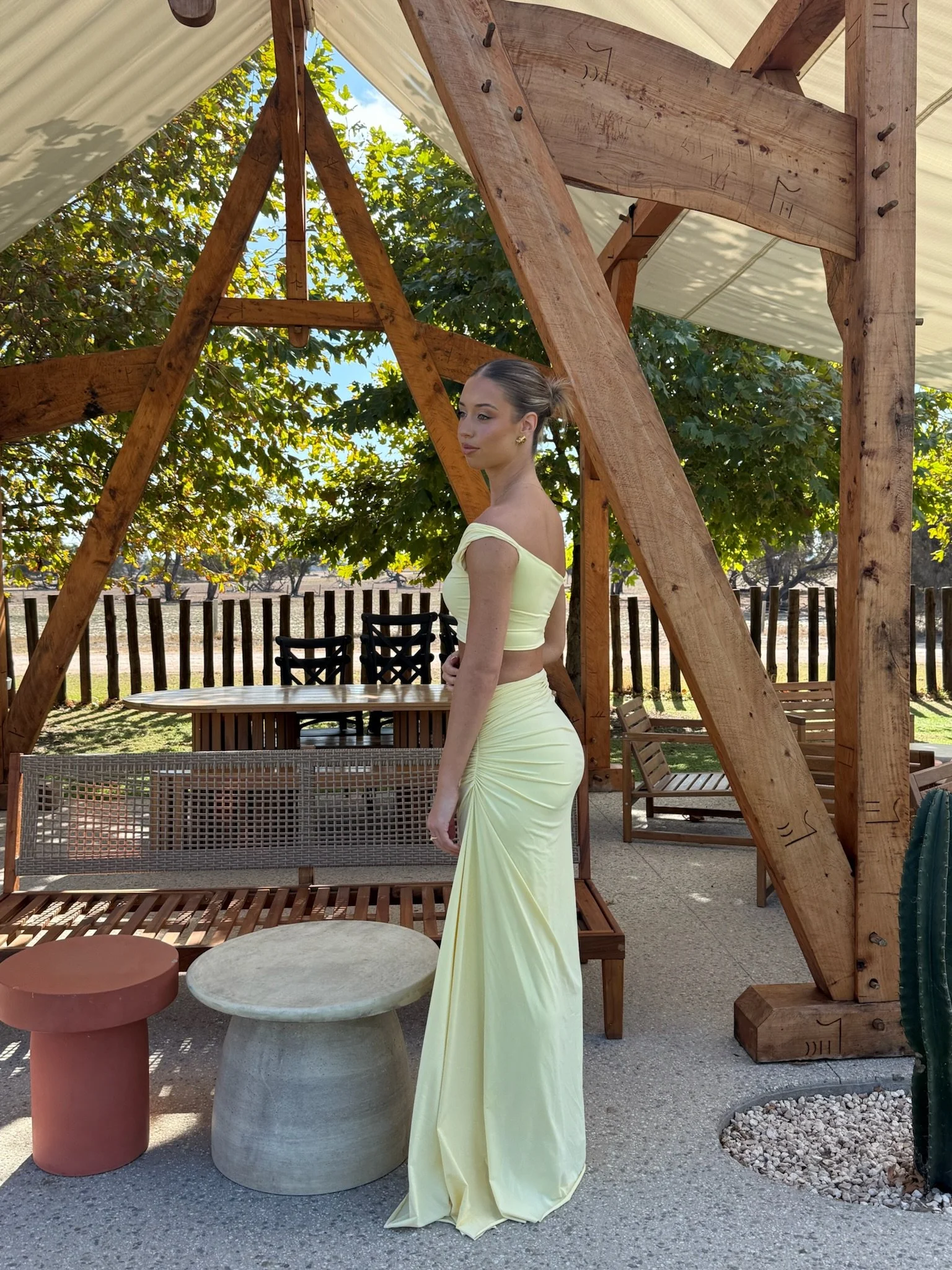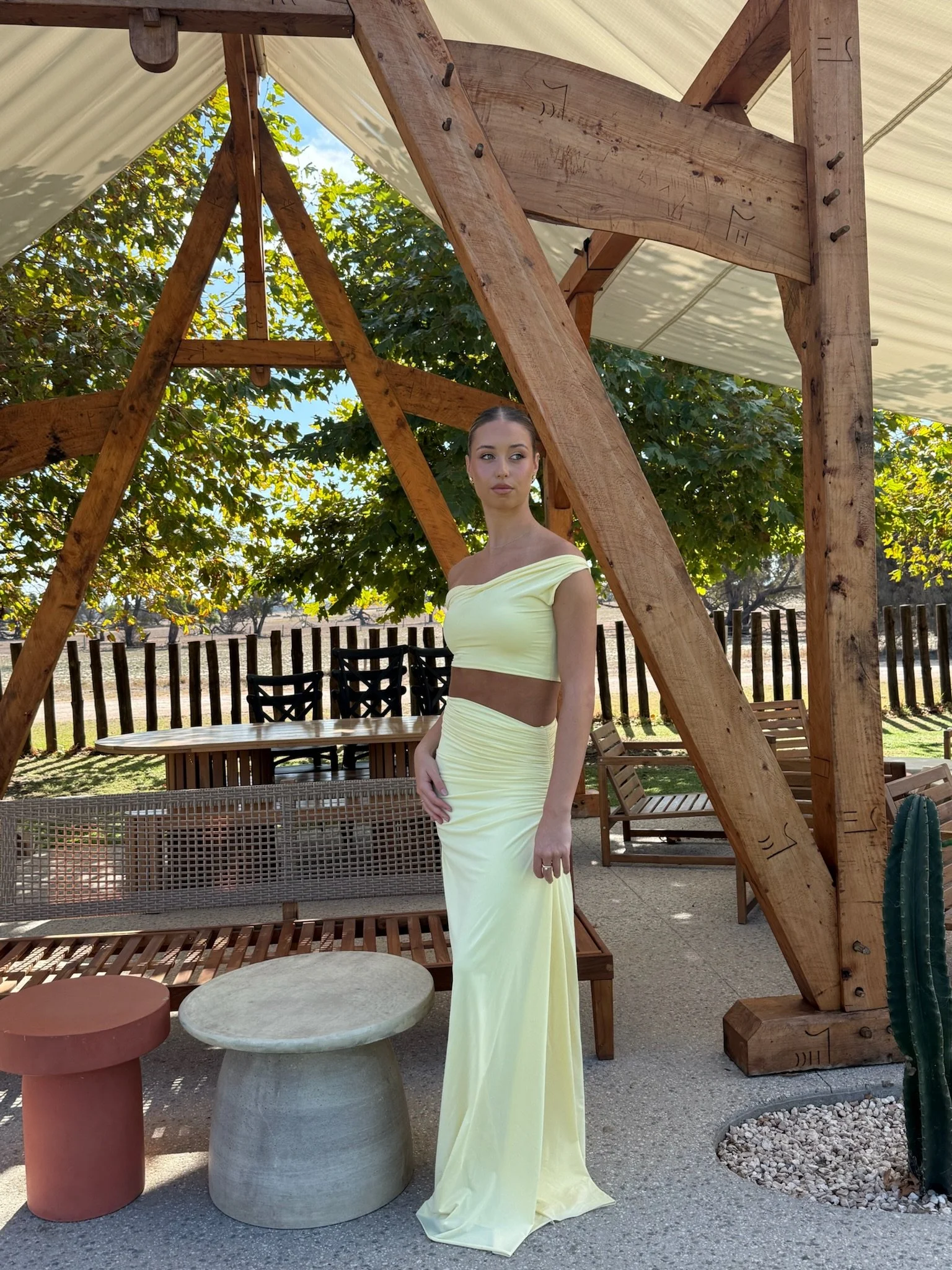 This set includes a crop top with draped shoulders and a long skirt with stylish ruching.